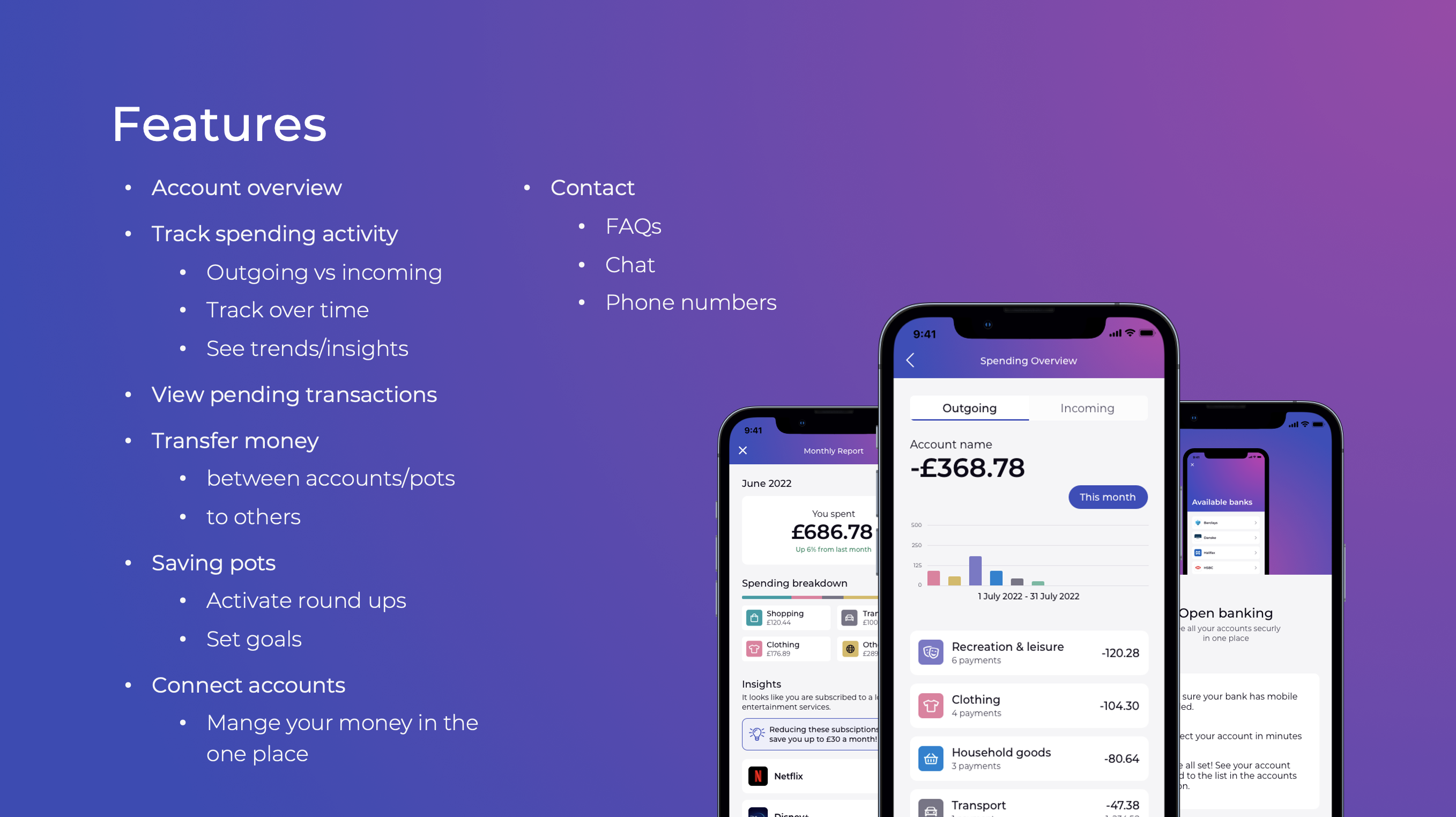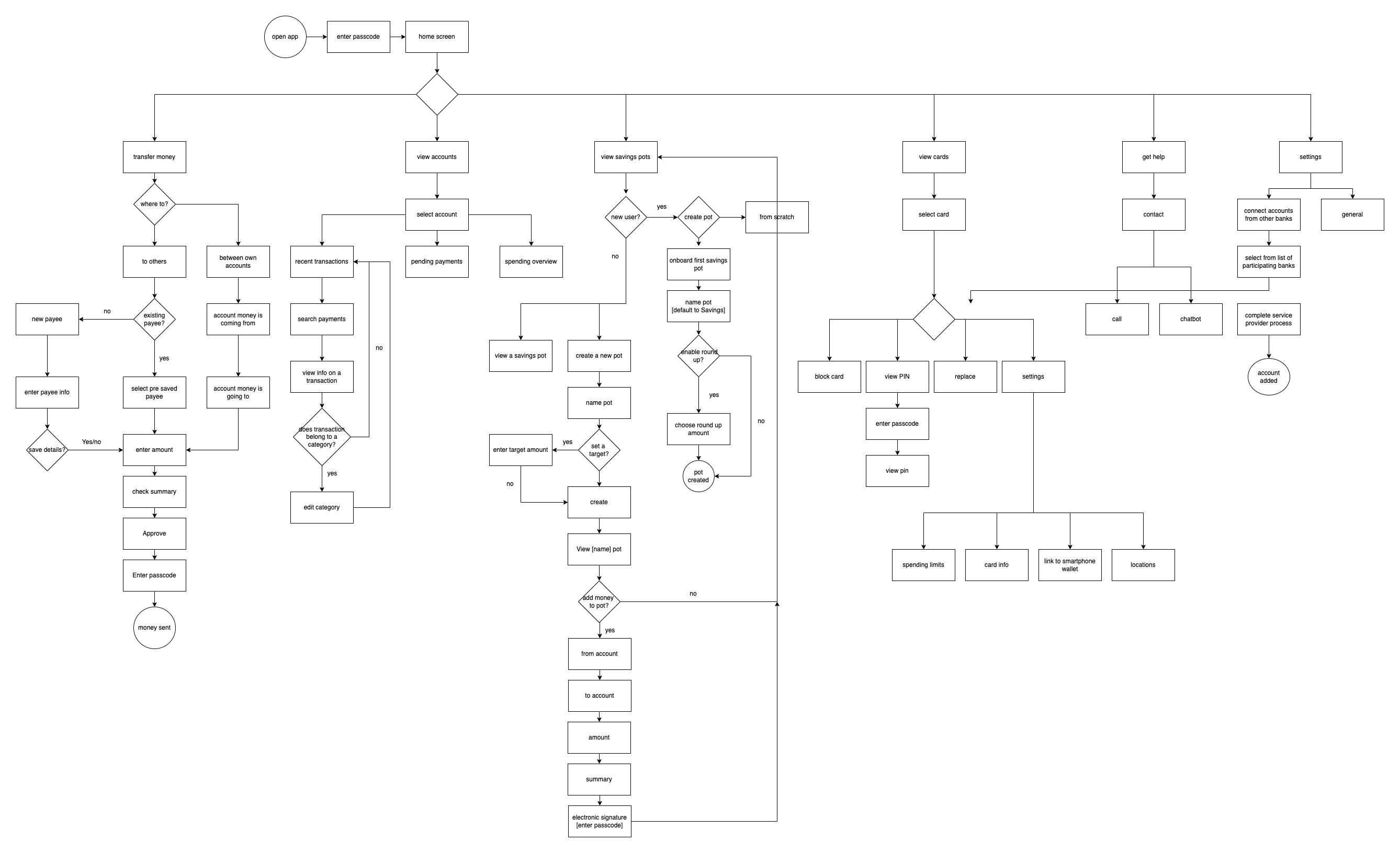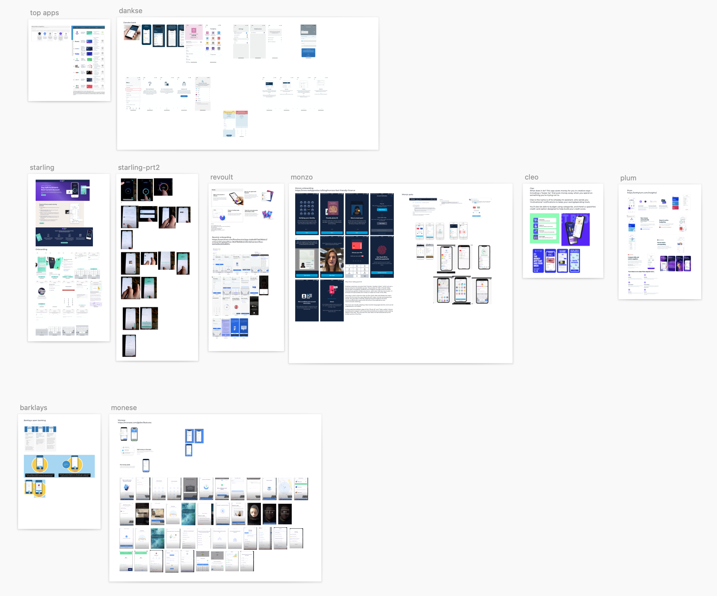 I decided to look for apps similar to Monzo, as there have been many other brands in the industry making the spotlight since then. I researched their features, wanting to understand what made people want to use these particular brands. I also wanted to understand their user flows, how they handled sign-ups, viewing accounts, transferring money etc.